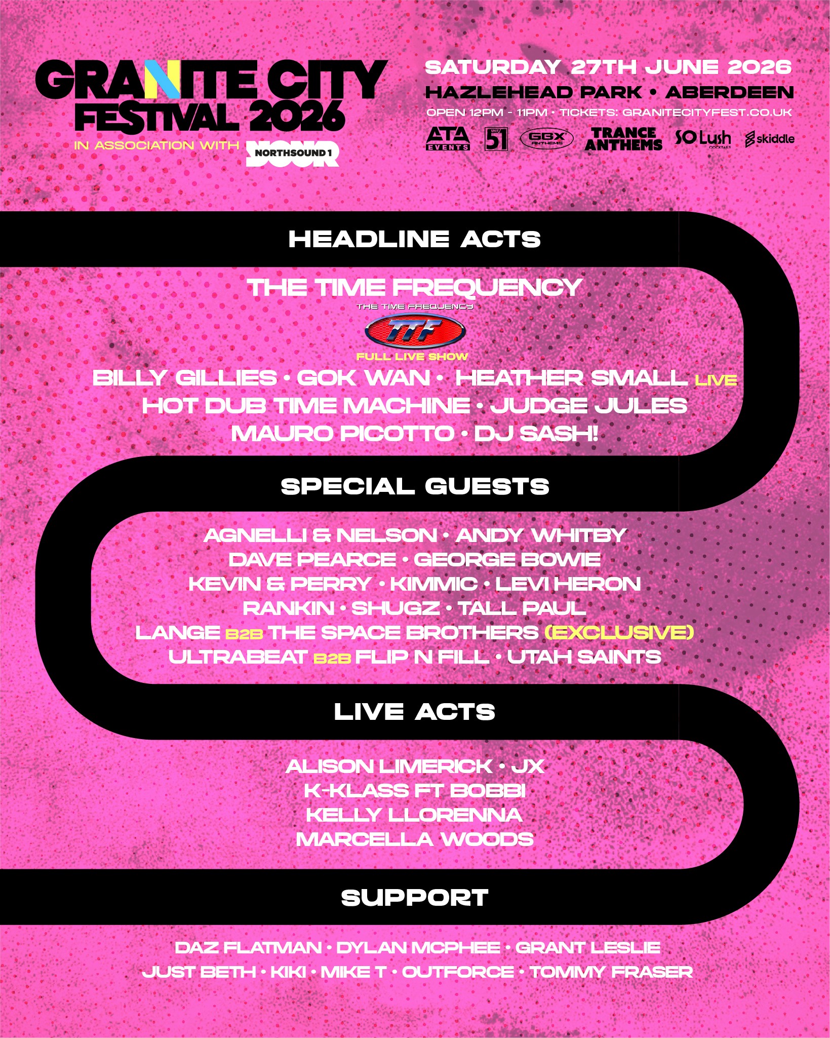 Granite City Festival brings you a strong list of special guests, including Andy Whitby, Callum Gallagher, Dave Pearce, Flip N Fill, George Bowie, Kevin & Perry, Kimmic, Rankin, Shugz, Tall Paul, and Utah Saints. A proper mix of nostalgia & club classics.